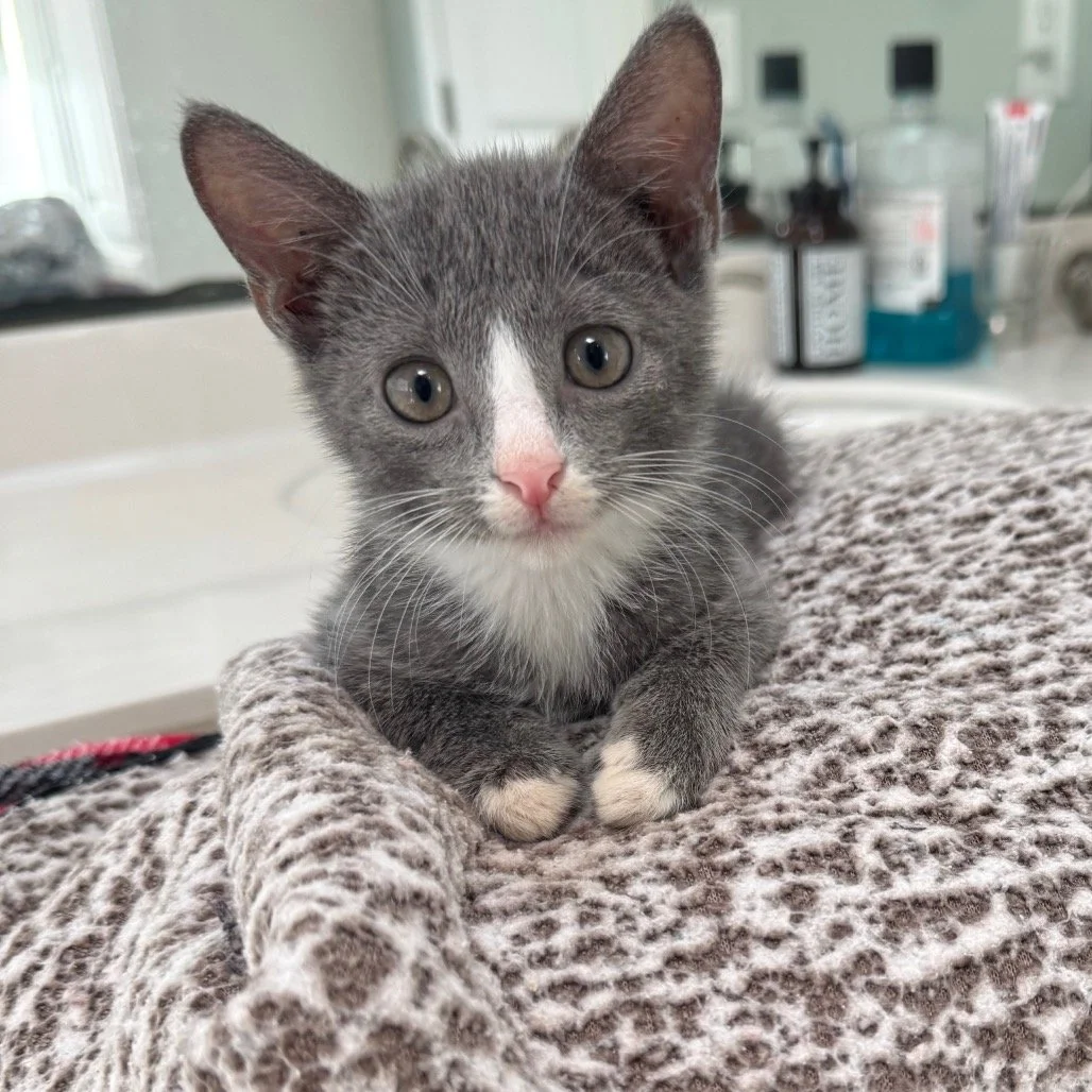 Description: Dorian is a gentle, soft-eyed kitten born right here in our care on June 12, 2025. He’s neutered, litter box trained, and sweet-natured — a little shy at first, but affectionate once he feels safe. Dorian enjoys quiet playtime and naps with his feline friends and does well with dogs, too. He would thrive in a calm home, especially with another friendly cat companion.